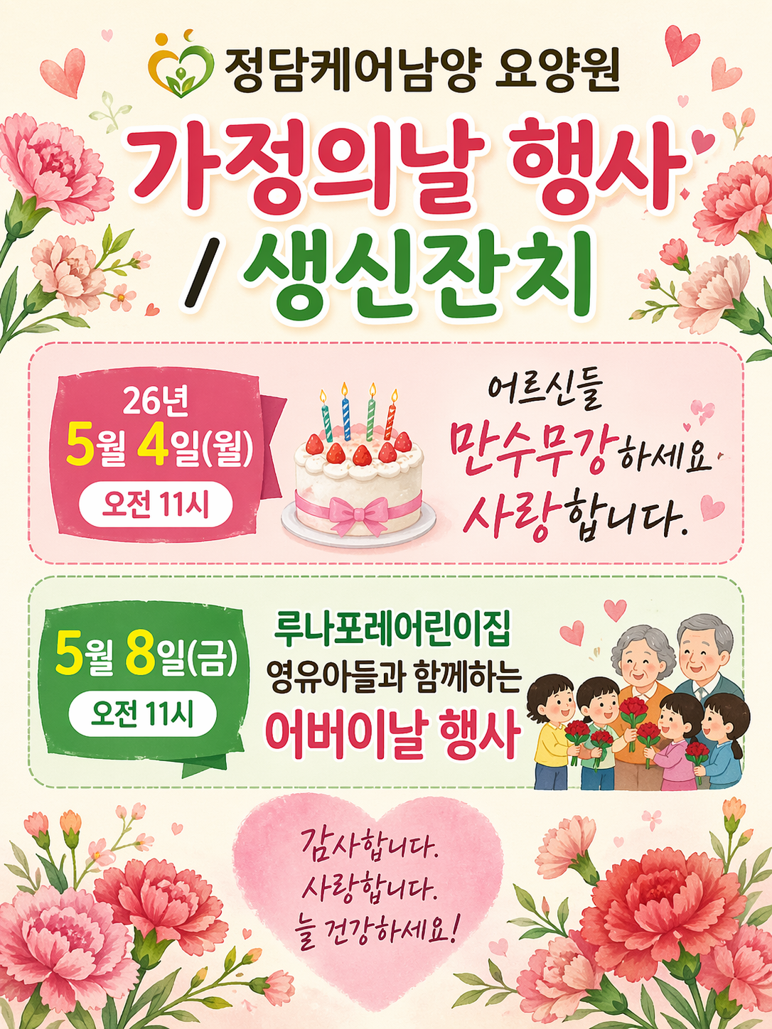 ![]() 안녕하세요 정담케어남양요양원입니다. 따뜻한 5월 가정의 달을 맞이하여 생신잔치 및 가정의 달 행사 ●일정: 2026년 5월 4일(월) 오전 11시 어버이날 행사 (루나포레 어린이집 연계) ●일정: 2026년 5월 8일(금) 오전 11시 어르신들께 즐거운 추억과 따뜻한 시간을 감사합니다. |